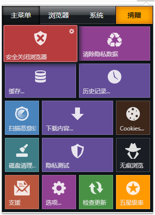 在主菜单中你可以清除浏览器缓存、历史记录、清除隐私数据、检查更新等等。
