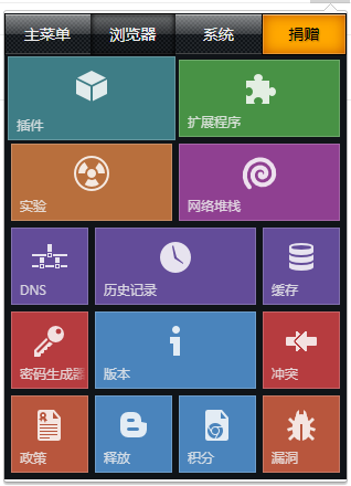 该插件主要分为三个部分主菜单、浏览器、系统(哈哈,有条件的主,可以捐赠):